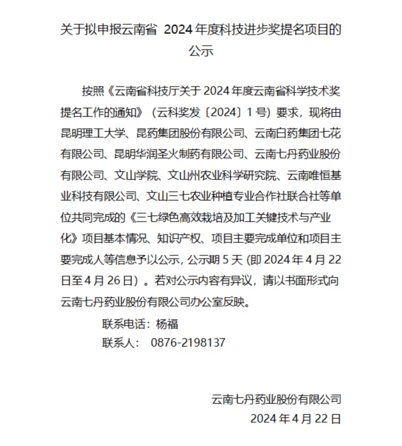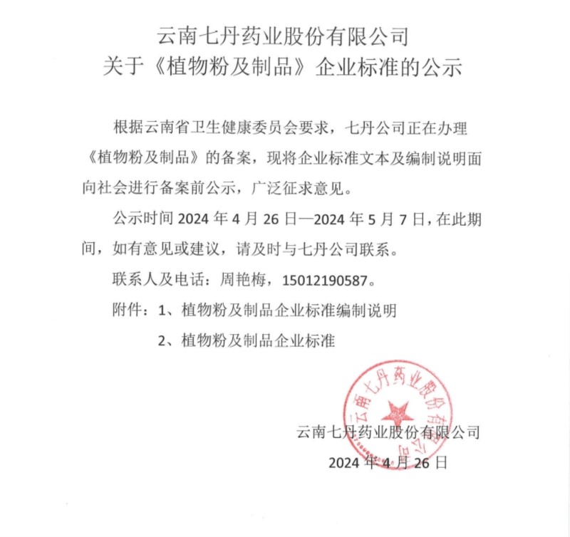 云南七丹藥業(yè)股份有限公司關(guān)于《七丹牌三七葛根膠囊》《七丹牌三七膠囊》企業(yè)標(biāo)準(zhǔn)的公示...