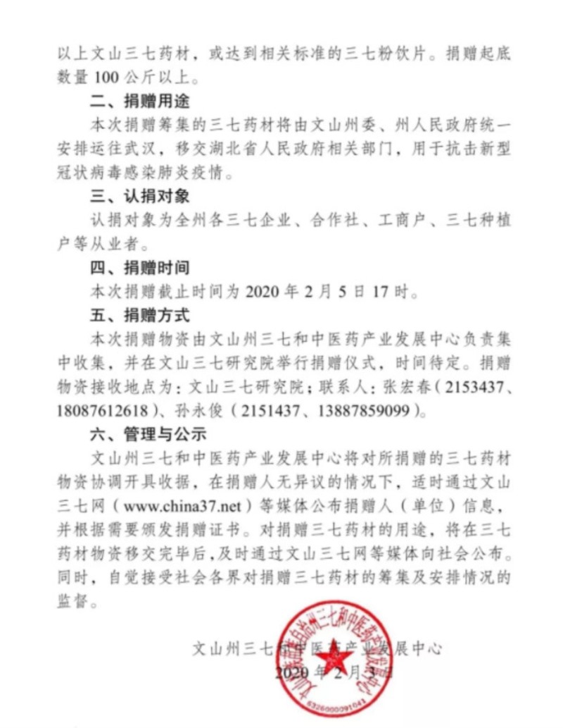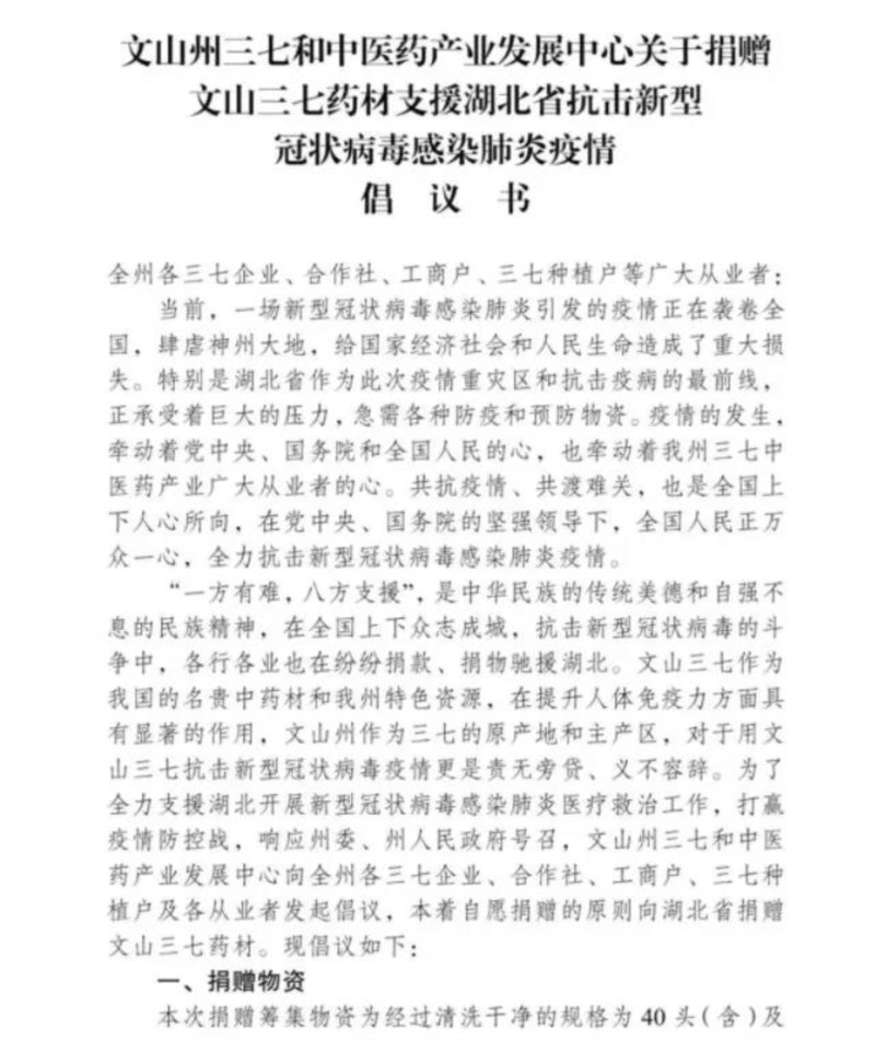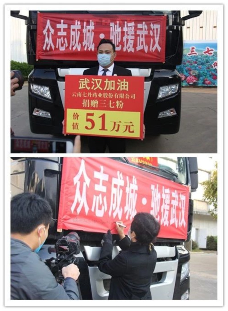 三七健康產品制造專家——云南七丹藥業(yè)股份有限公司心系疫情,第一時間積極響應,在文山州三七和中醫(yī)藥產業(yè)發(fā)展中心的組織下,將庫存的獲得云南十大名藥材第一名的七丹牌三七制作的成本價為51萬元的70件910公斤三七超細粉全部捐贈給武漢。用行動詮釋品牌社會責任感,為疫情防治貢獻一份力量。