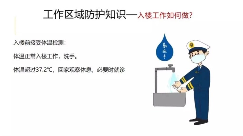 進(jìn)入辦公樓前自覺接受體溫檢測(cè),體溫正??扇霕枪ぷ?,并到衛(wèi)生間洗手。若體溫超過37.2℃,請(qǐng)勿入樓工作,并回家觀察休息,必要時(shí)到醫(yī)院就診。