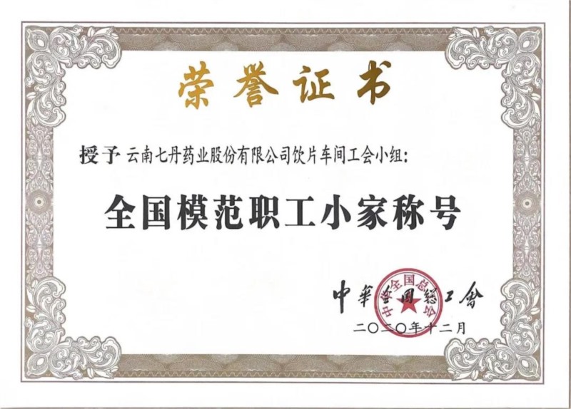 近日,云南七丹藥業(yè)股份有限公司飲片車間榮獲由中華全國(guó)總工會(huì)頒發(fā)的“全國(guó)模范職工小家”稱號(hào)。