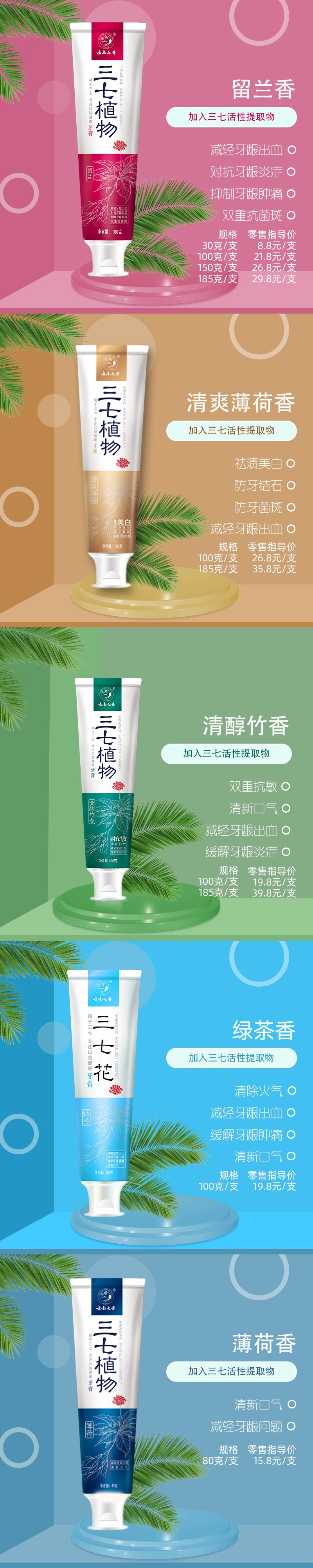七丹藥業(yè)以13年專注三七及三七系列產(chǎn)品的科研積累為基礎(chǔ),以消費(fèi)者日益增長的口腔護(hù)理新需求為出發(fā)點(diǎn),用文山道地三七等名貴原料精心研制而成,依托獨(dú)有資源,打造每一只道地三七植物牙膏,其具有獨(dú)特的活血化瘀、消腫定痛、防治口腔潰瘍等功效,口感清新,市場(chǎng)前景廣闊,是云南七丹藥業(yè)股份有限公司精心打造的一款拳頭產(chǎn)品。