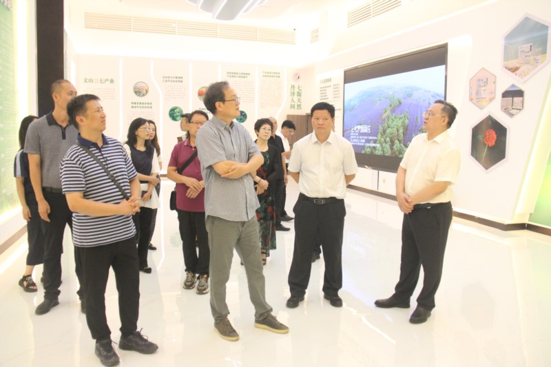 七丹藥業(yè)公司董事長楊朝文向調研組一行匯報了七丹藥業(yè)的基本情況,并陪同觀看了文山三七宣傳片,參觀了七丹三七歷史文化展館、產品展示中心以及三七科技種植示范基地。王主任等領導對七丹藥業(yè)工作提出了指導性意見。