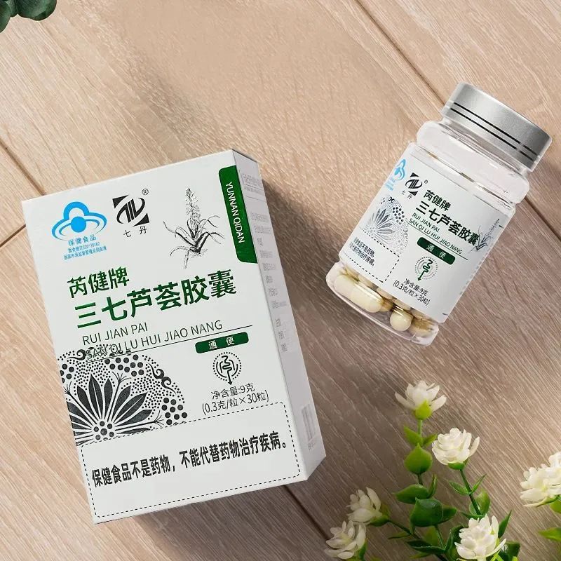 芮健牌三七蘆薈膠囊精選七丹公司自有道地綠色三七GAP種植基地原料,配伍蘆薈全葉干粉及藥食同源中藥材決明子,采用國家專利技術(shù)提取藥材有效成分,經(jīng)粉碎、過篩、混合、制粒、填充等工藝精制而成。經(jīng)動(dòng)物和人體試食實(shí)驗(yàn)證明,具有通便保健功能。