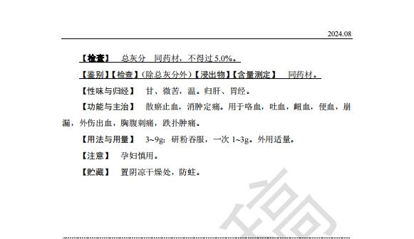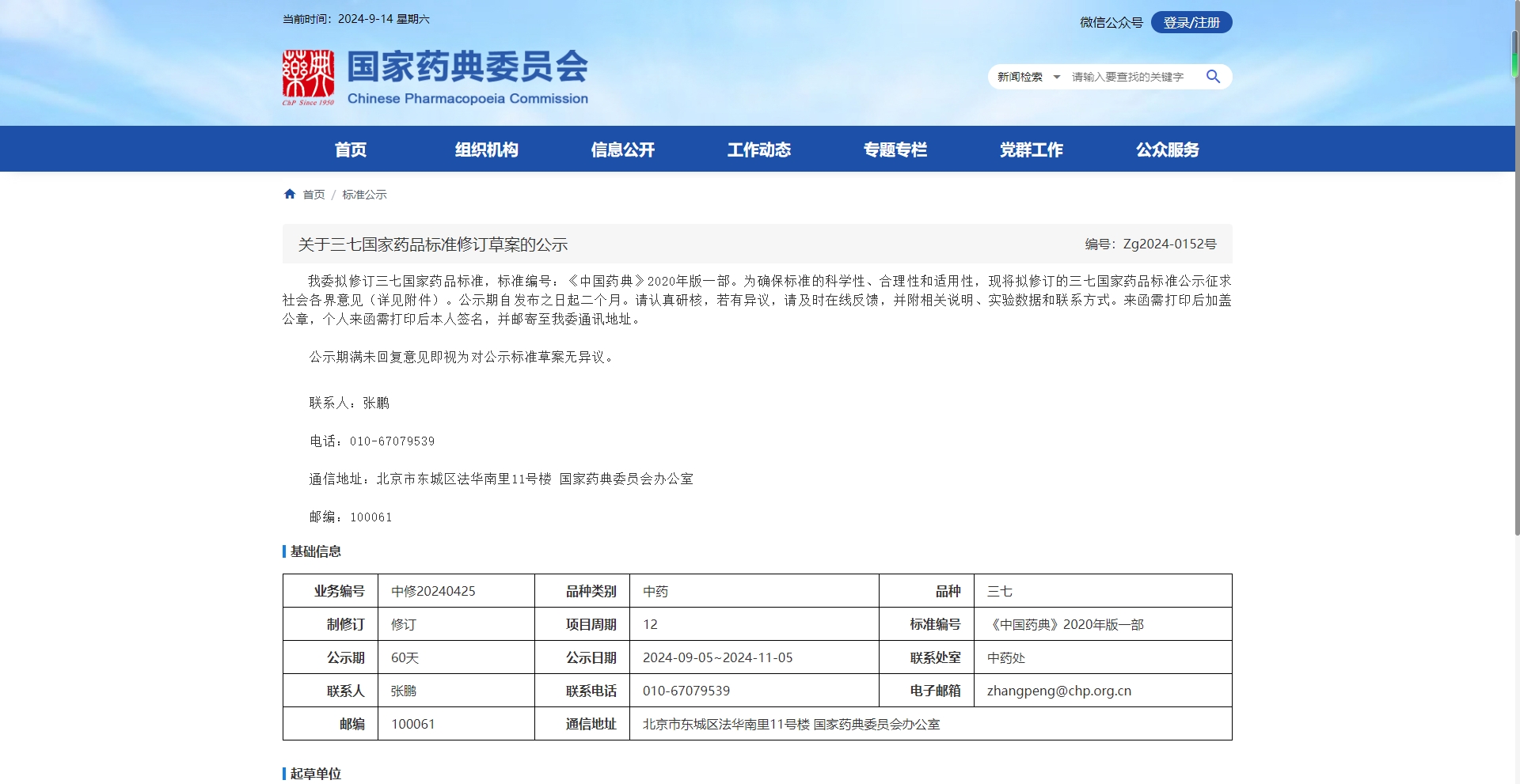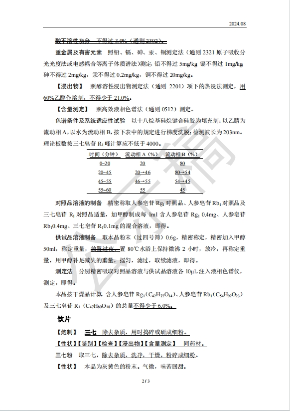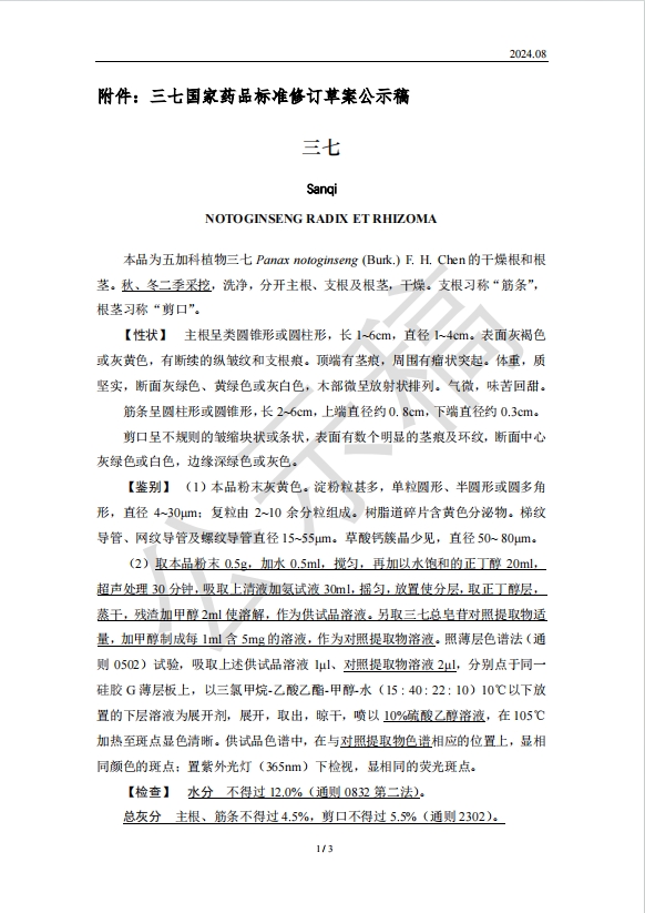 修訂草案中將三七總皂苷總量由不少于5.0%提升至6.0%,水分由不超過14.0%改為不超過12.0%,總灰分由不超過6.0%改為主根、筋條不超過4.5%,剪口不超過5.5%。