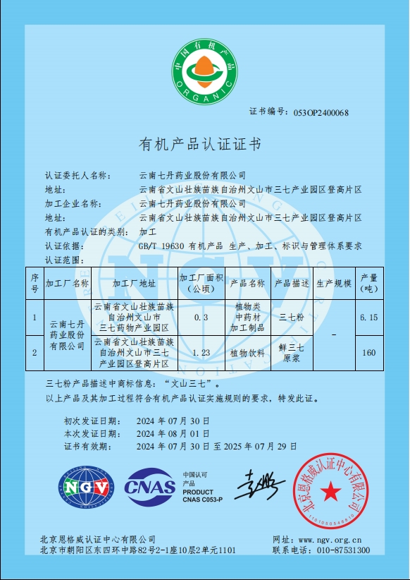 公司三七種植基地先后獲得云南省綠色食品牌、云南省定制藥園、文山州高品質(zhì)藥園等多項(xiàng)認(rèn)定。公司6個(gè)基地共1451畝三七種植基地通過云南省第一批新版中藥材GAP基地評(píng)價(jià),也是全國第一批通過中藥材GAP認(rèn)證的基地;林下三七種植基地獲得有機(jī)產(chǎn)品認(rèn)證證書。通過多年的探索研究,公司掌握了三七種植核心技術(shù),基本解決三七連作障礙問題,不僅保證了三七產(chǎn)品質(zhì)量,也為三七產(chǎn)業(yè)的高質(zhì)量發(fā)展提供了有力的技術(shù)支撐,以實(shí)際行動(dòng)詮釋了高品質(zhì)三七典范的使命與擔(dān)當(dāng)。