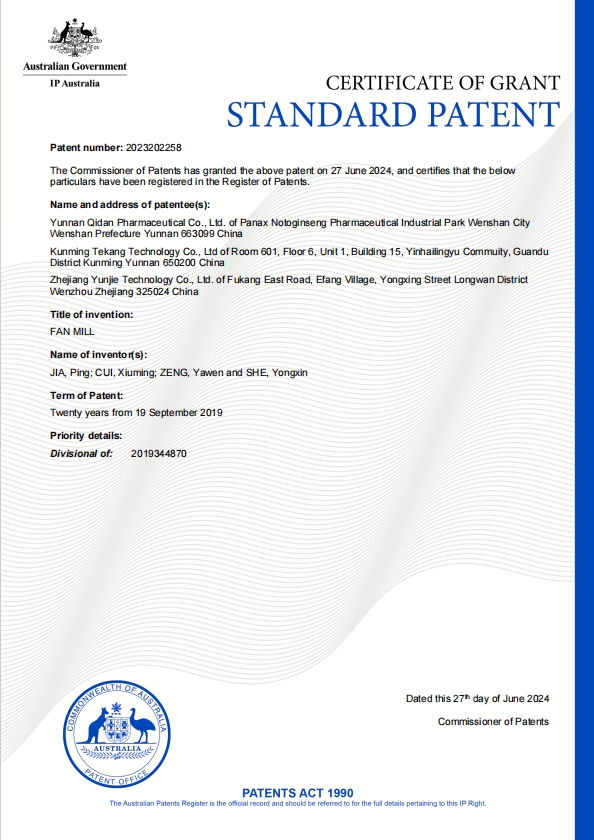 近日,云南七丹藥業(yè)股份有限公司通過PCT(專利合作條約)途徑申請的“鮮三七快速干燥工藝技術(shù)及設(shè)備”國際專利在澳大利亞獲得授權(quán)。這是七丹藥業(yè)繼2021年獲得南非專利...