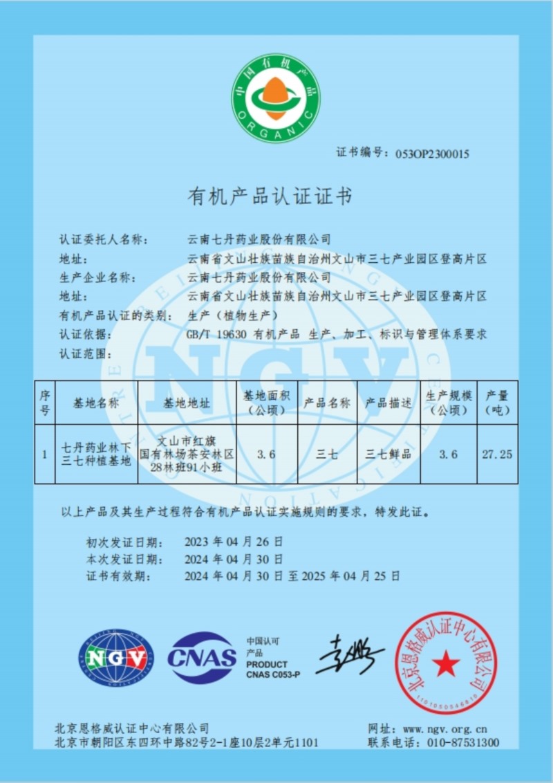 近日,七丹藥業(yè)位于文山市紅旗國(guó)有林場(chǎng)的林下三七種植基地獲“有機(jī)產(chǎn)品認(rèn)證證書(shū)”,標(biāo)志著七丹藥業(yè)創(chuàng)新三七種植技術(shù)取得新突破。